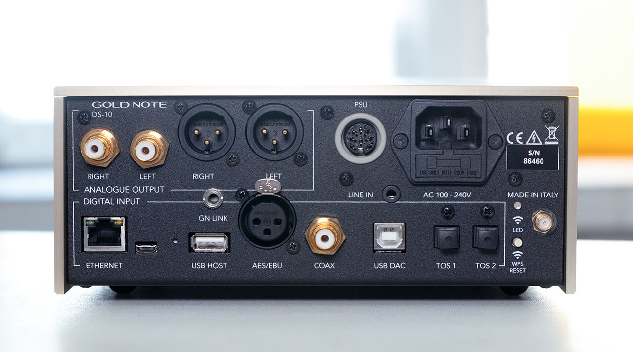 - Digitale Eingänge: USB-B, USB-A (bis DSD256), Coax, AES/EBU, 2× Toslink.Gold Note
