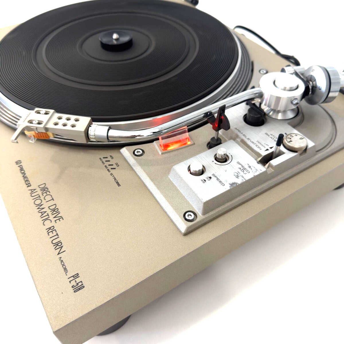 Der Pioneer PL-510 war ein Direktantriebs-Plattenspieler mit DC-Servomotor, Stroboskop, Pitch-Control und einem statisch ausbalancierten S-förmigen Tonarm. Genau diese Mischung machte ihn damals so attraktiv: Er sah hochwertig aus, bot moderne Technik und vermittelte dem Käufer das Gefühl, bereits in einer ernsthaften HiFi-Klasse angekommen zu sein. Vinyl Engine beschreibt den PL-510 als „high precision direct drive turntable“, also als präzisen Direkttriebler für die klassische Komponentenanlage. Reverb-Zusammenfassungen zum Modell nennen ebenfalls die Kernelemente: Direktantrieb, automatische Rückführung, Pitch-Control und Stroboskop.